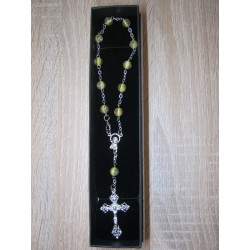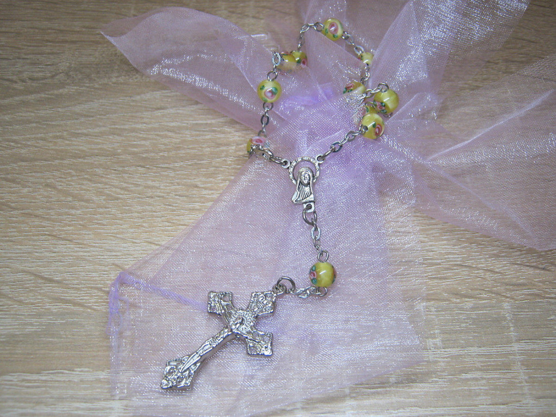 Růženec z vinutých skleněných perlí, kuličky o průměru 8mm barvy žluté, zdobené malbou růžičky.