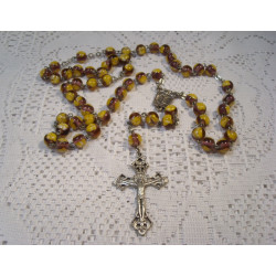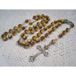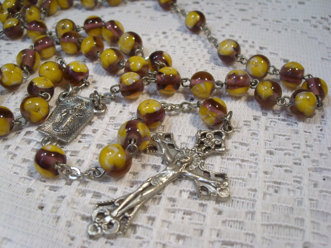 Růženec katolický z vinutých skleněných perlí, kuličky o průměru 8mm barvy fialové, zdobené malbou žluté kytičky.
