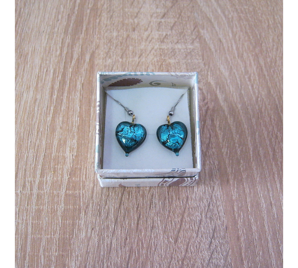 Náušnice ve tvaru srdíček - sklo s plátkovým stříbrem uvnitř.