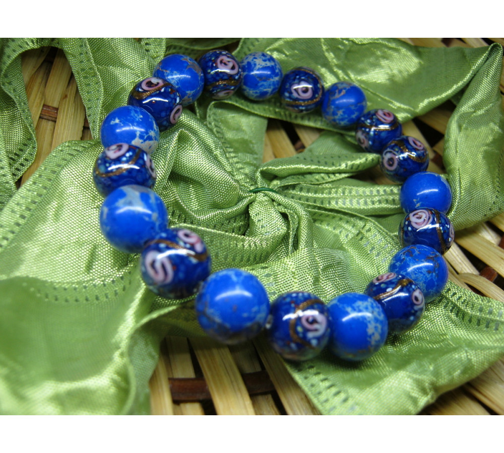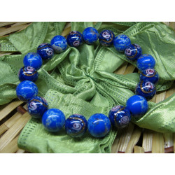 Náramek z vinutých skleněných perlí - kuličky 10mm tmavě modré barvy, zdobeno skleněnou drtí, avanturinovou nití a růžičkami.