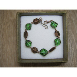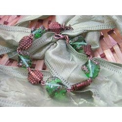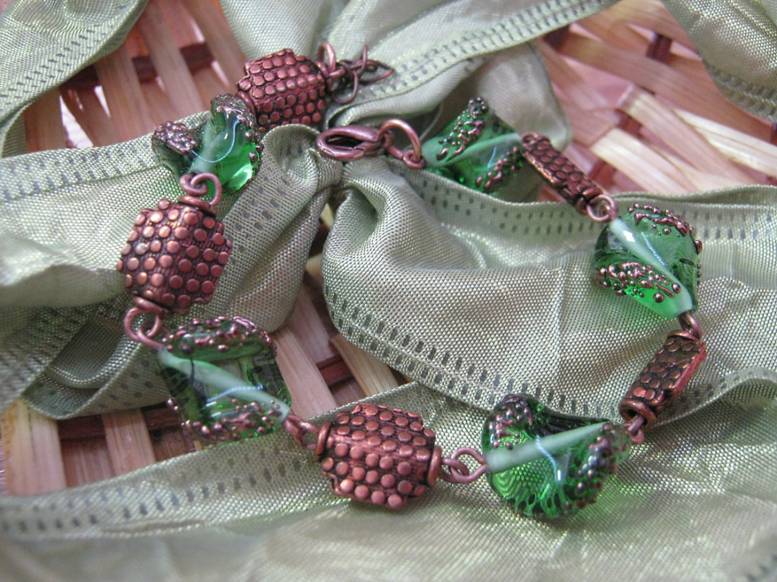 Originální náramek z vinutých skleněných perlí a komponentů z mědi.