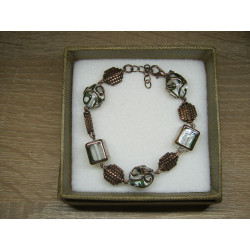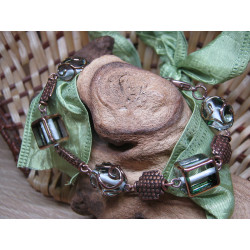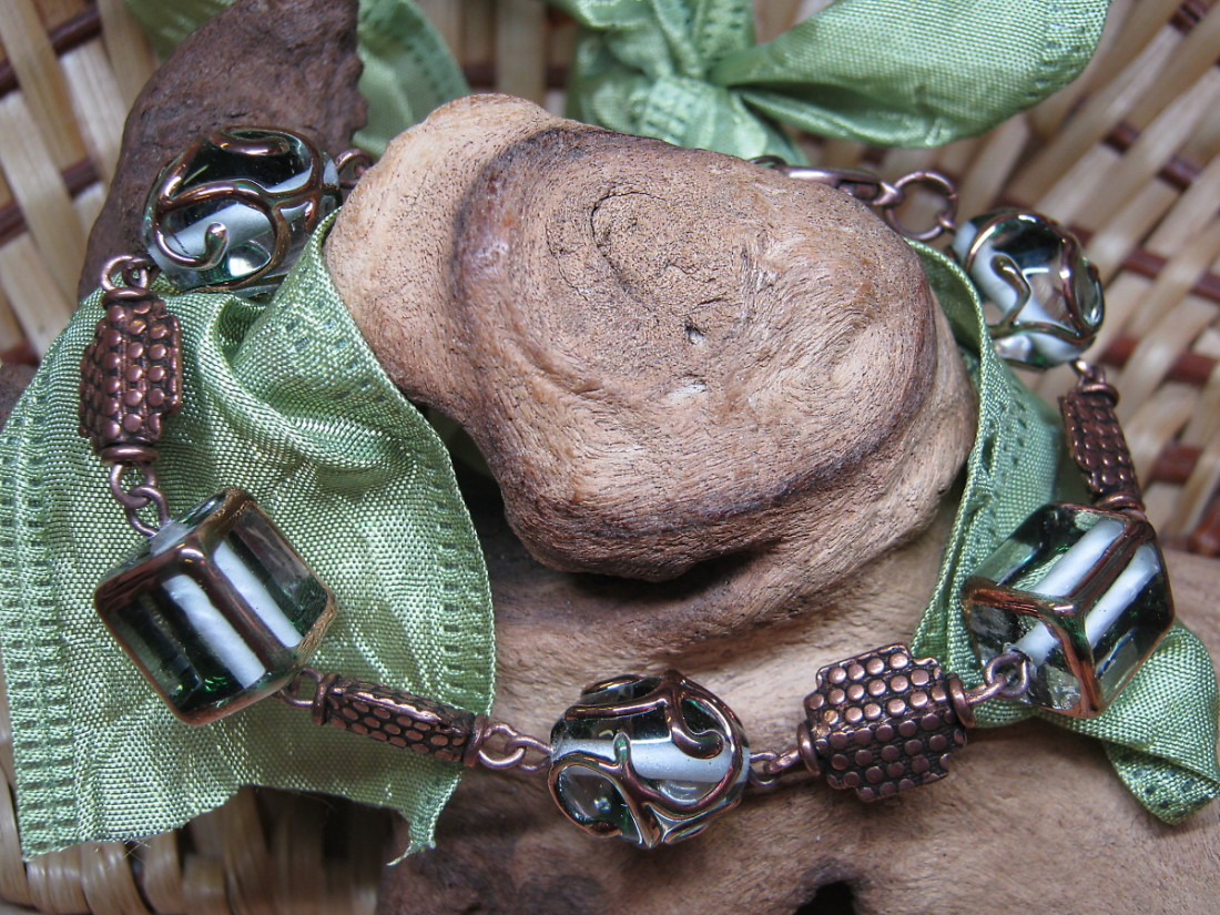 Originální náramek z vinutých skleněných perlí a komponentů z mědi.