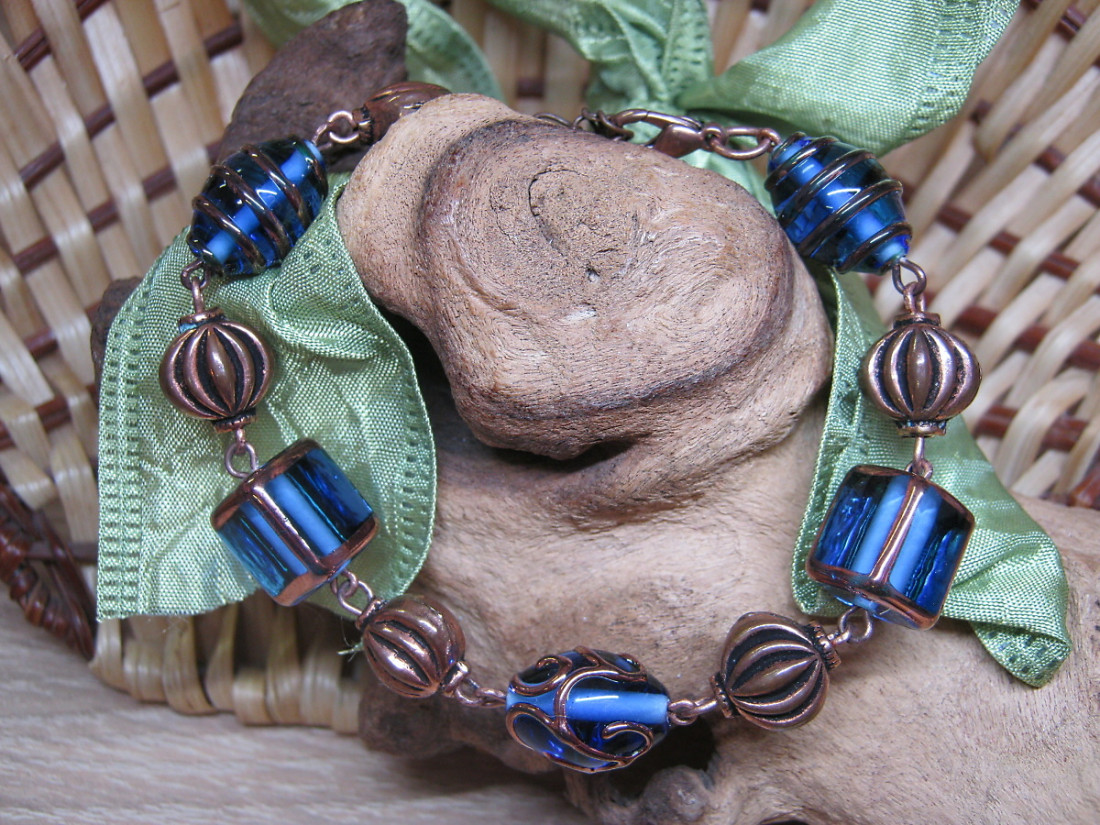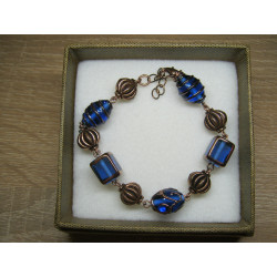 Originální náramek z vinutých skleněných perlí a komponentů z mědi.