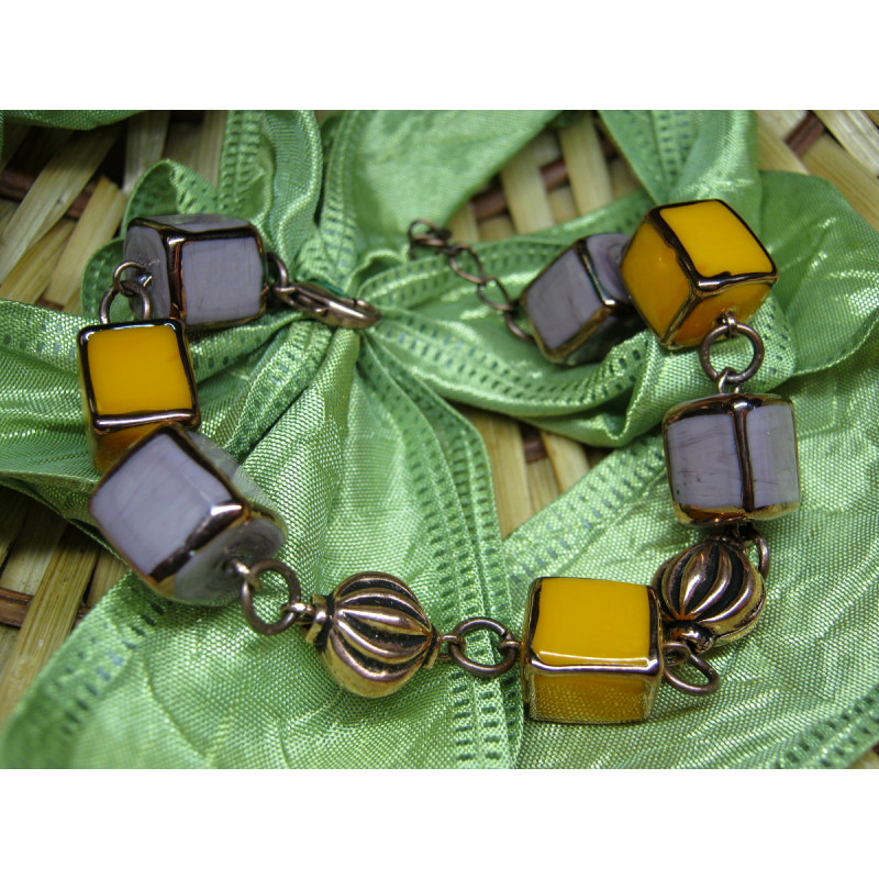 Originální náramek z vinutých skleněných perlí a komponentů z mědi.