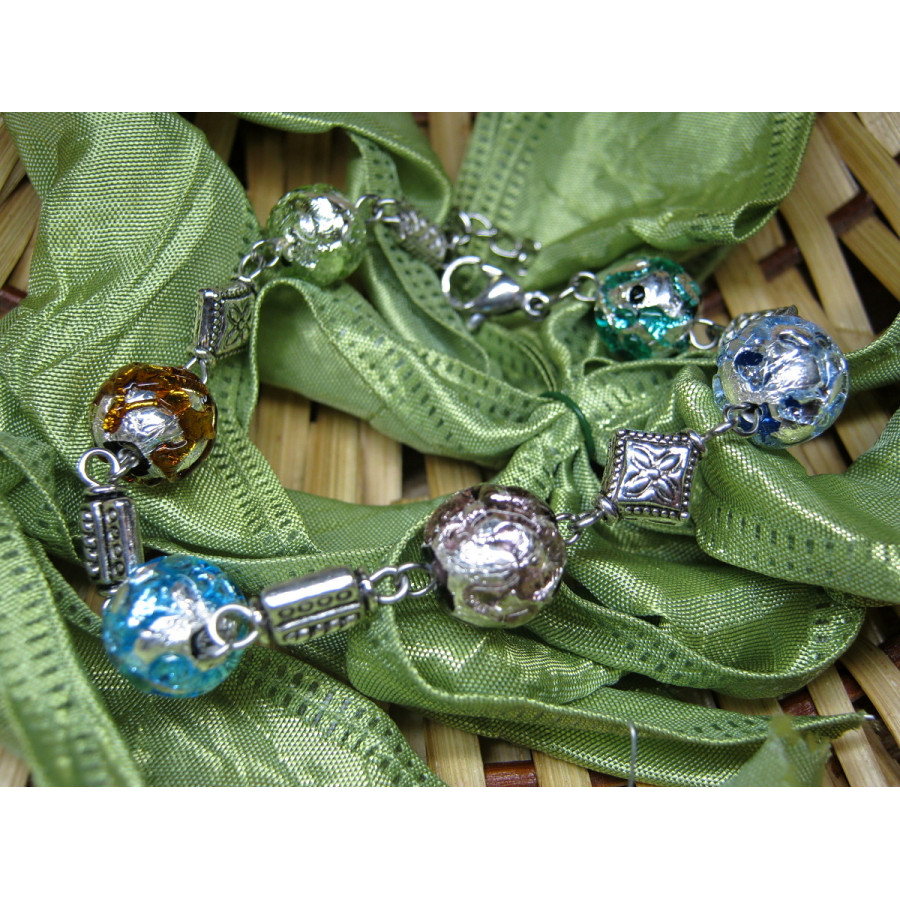 Náramek z vinutých skleněných perlí s plátkovým stříbrem, doplněno o ocelové a bižuterní komponenty.