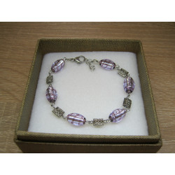 Vinuté perle olivky 12/8mm fialová + světle fialová s plátkovým stříbrem uvnitř, zdobené tmavě fialovou.