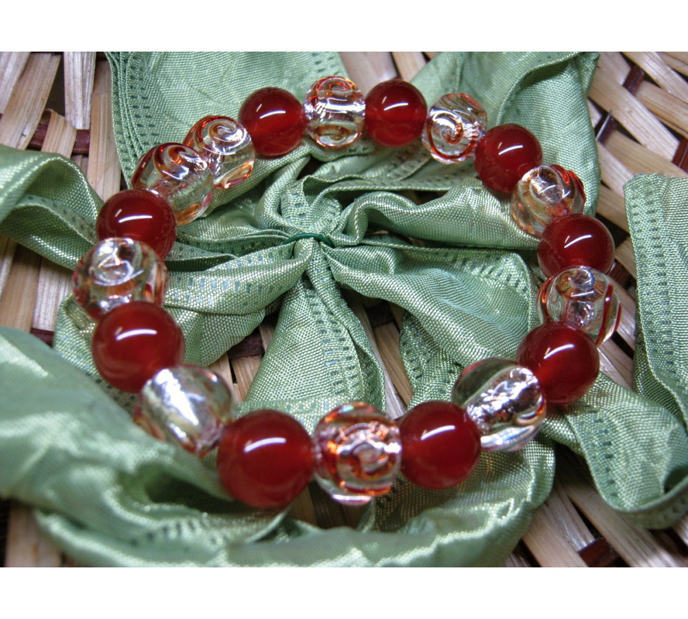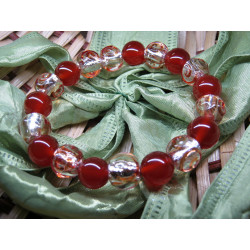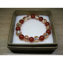 Bracelet made of coiled glass beads - crystal balls 10mm, decorated with silver leaf and red thread.