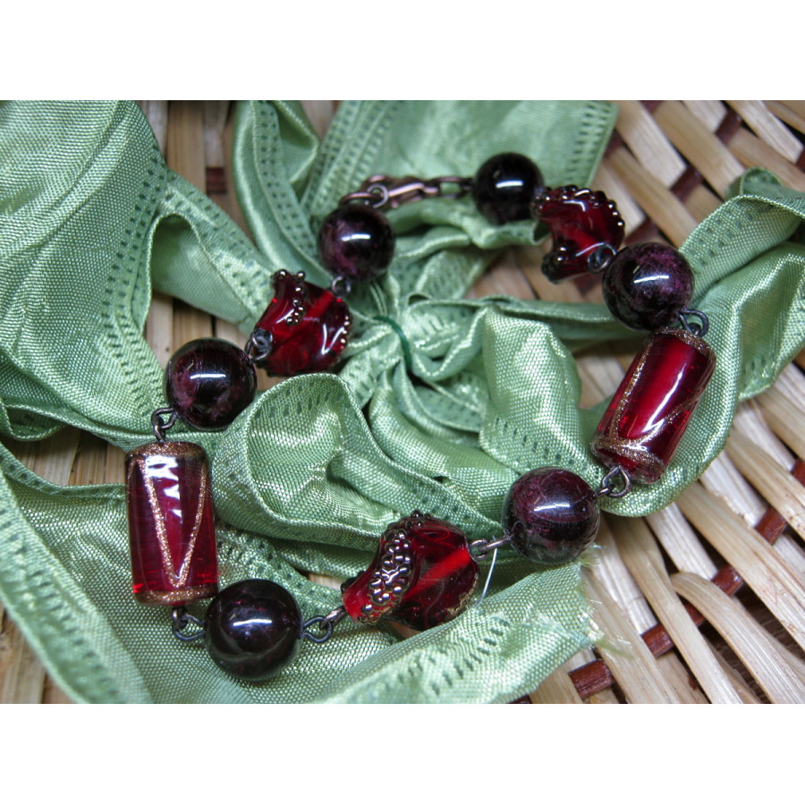 Original bracelet made of coiled glass beads and stone garnet almandine.