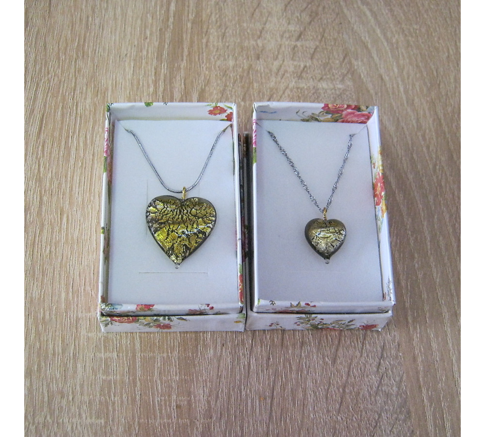 Glass heart pendants with silver foil inside, color gray to gold.