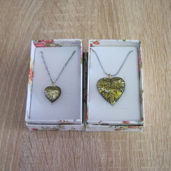 Glass heart pendants with silver leaf inside.
