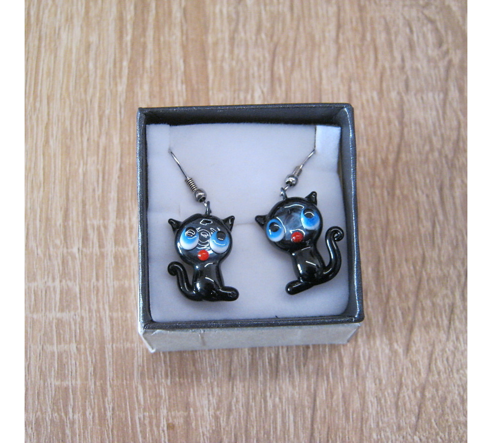 Original earrings made of glass miniatures - black cats.